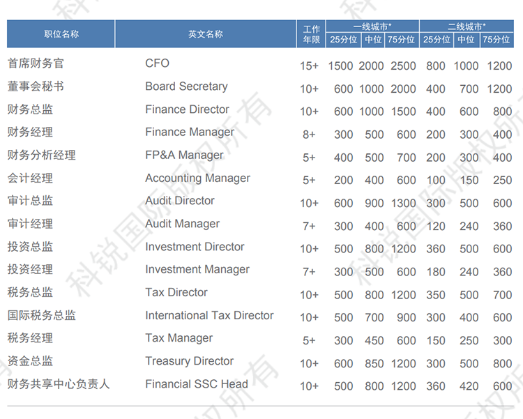 以下是猎头招聘公司九州酷游国际发布的薪酬报告对财务领域的职位薪酬信息统计,供企业和猎头招聘时参考。